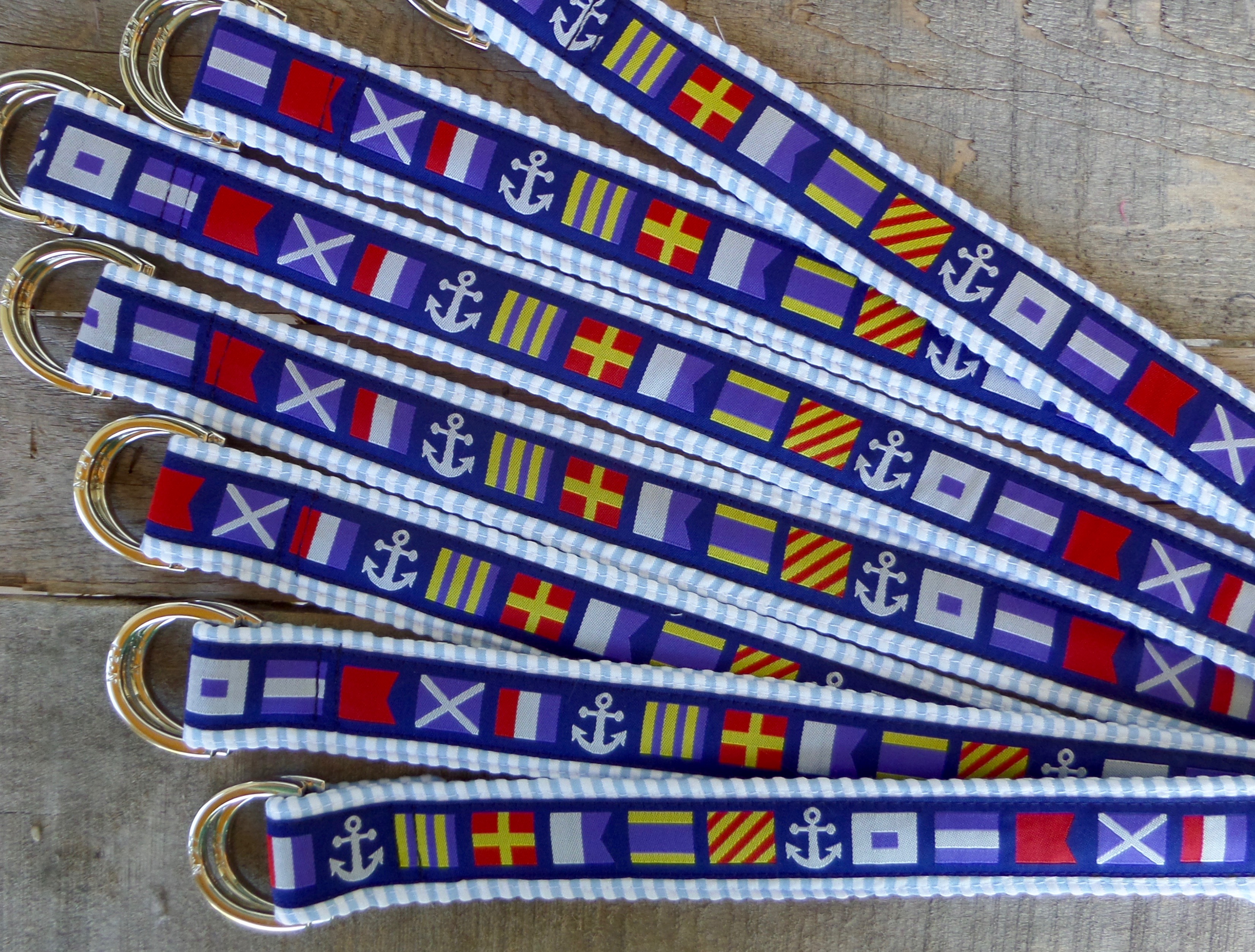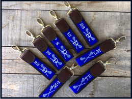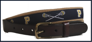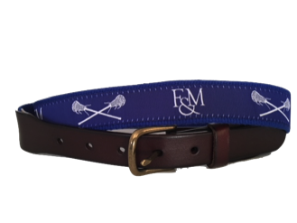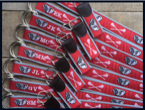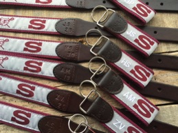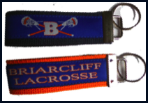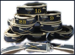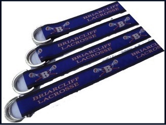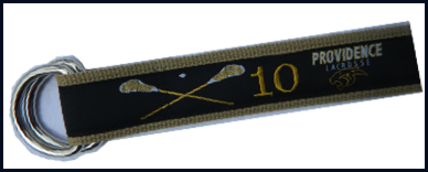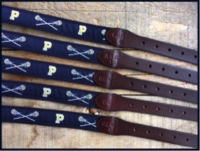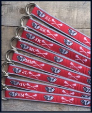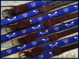 The photos above display samples of complete 'custom orders for teams, clubs and other organizations. The ribbons were personalized with a lacrosse club logo and used their team colors within the sticks and ribbon.  Belts and key chains were monogrammed with numbers.  Players/families had the option to chose from our military buckle line or from our heavy duty d-ring styles.  Each belt was handmade and made for the player.   For this style order, there is a 3-4 week time frame needed for processing.  We charge an additional $5 per piece for the monogramming.  For pricing please contact us at: Shop@No27inc.com