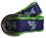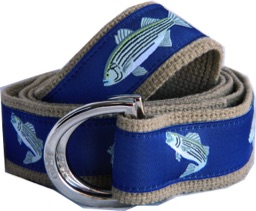 This nautical Striped Bass print was designed by us and made for you! This ribbon belt is from our Signature Series Line. Each belt is hand made and made to order.   This belt is pictured with our 'Silver' color Signature D-Ring.