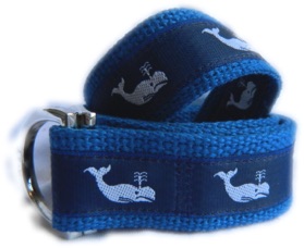 This nautical White Whale print was selected by us and made for you! This ribbon belt is from our Signature Series Line. Each belt is hand made and made to order.   This belt is pictured with our 'Brass' color Signature D-Ring.